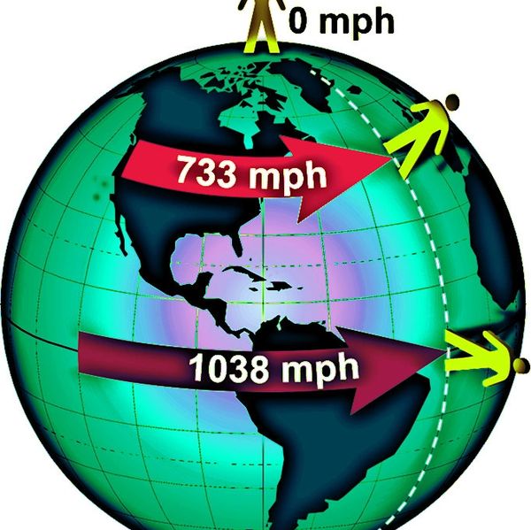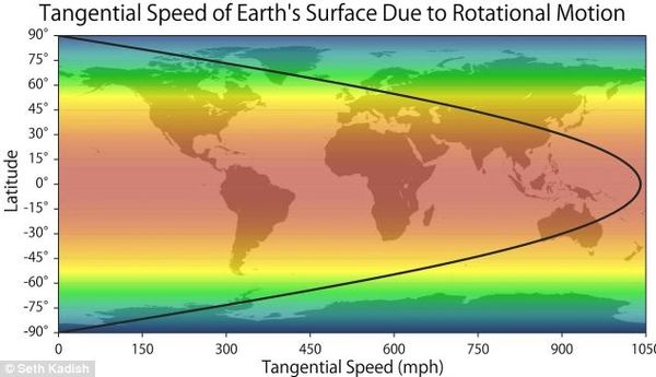 https://www.dailymail.co.uk/sciencetech/article-2546864/How-fast-YOU-spinning-Earths-axis.html . For example, in North Carolina at 35 degrees north latitude we are moving at around 840 miles per hour. The velocity diminishes as one moves further away from the equator.